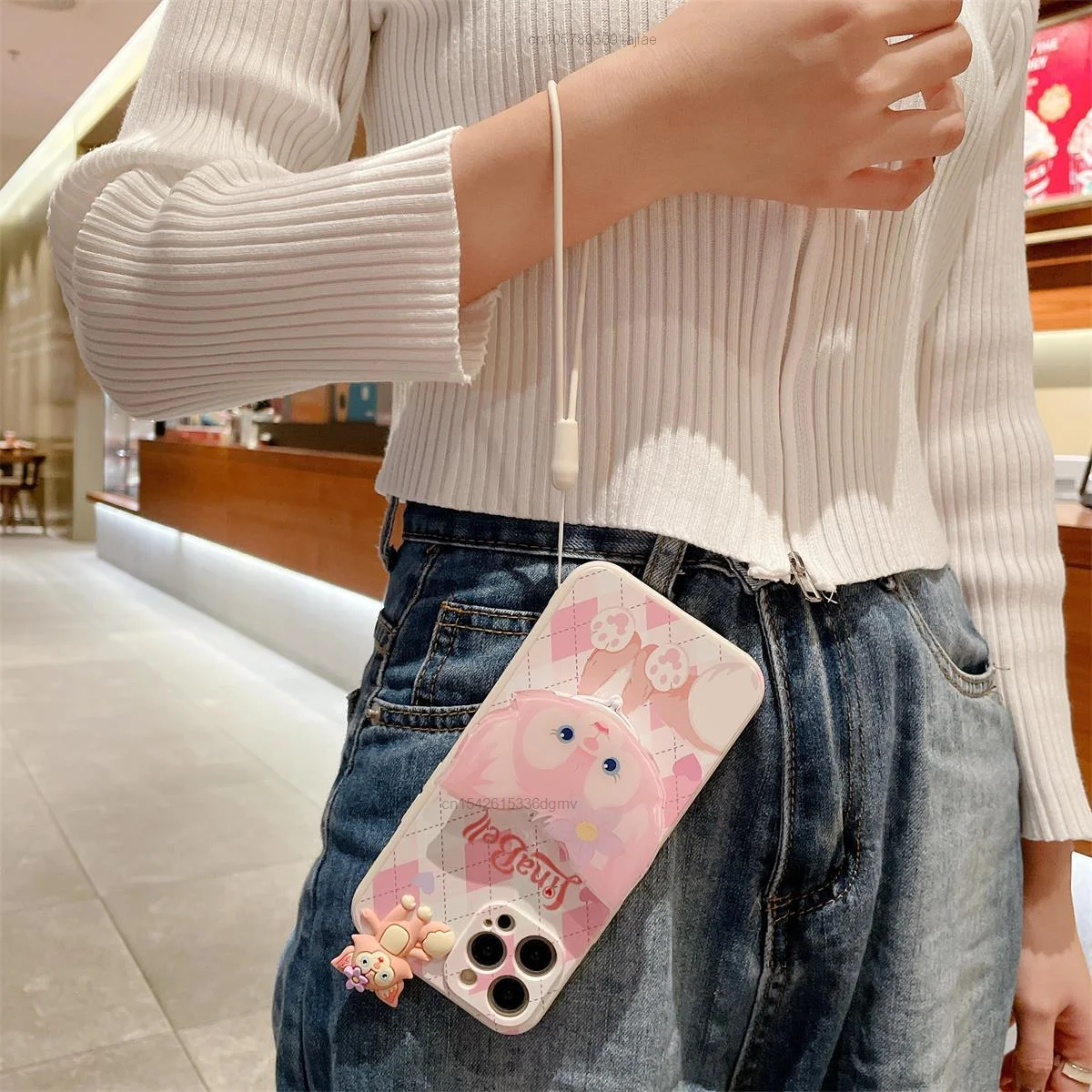 - حافظة هاتف بتصميم علامة تجارية فاخرة من Disney لهواتف Iphone 13 12 11 Pro Max وxr XS X 7 8 Plus مع حامل بحزام مرآة للنساء
