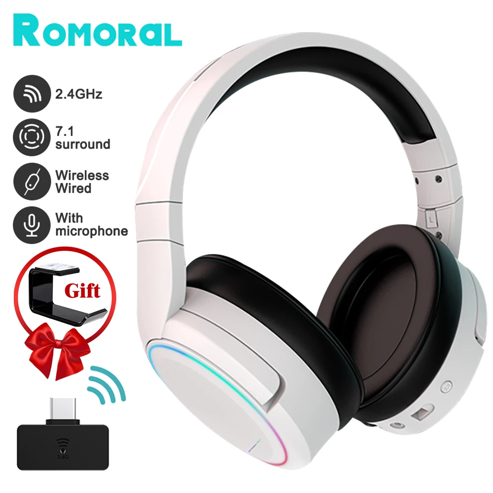 - رومورال سماعات الألعاب 2.4GHz سماعات رأس لاسلكية الرأس 7.1 الصوت المحيطي مع هيئة التصنيع العسكري إلغاء الضوضاء ألعاب سماعات الأذن