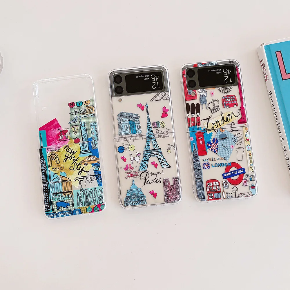 - الأزياء نيويورك لندن السفر ملصقا الهاتف حالة لسامسونج غالاكسي Z فليب 3 5G سليم واضح الصلب PC غطاء ل غالاكسي Z الوجه 5G