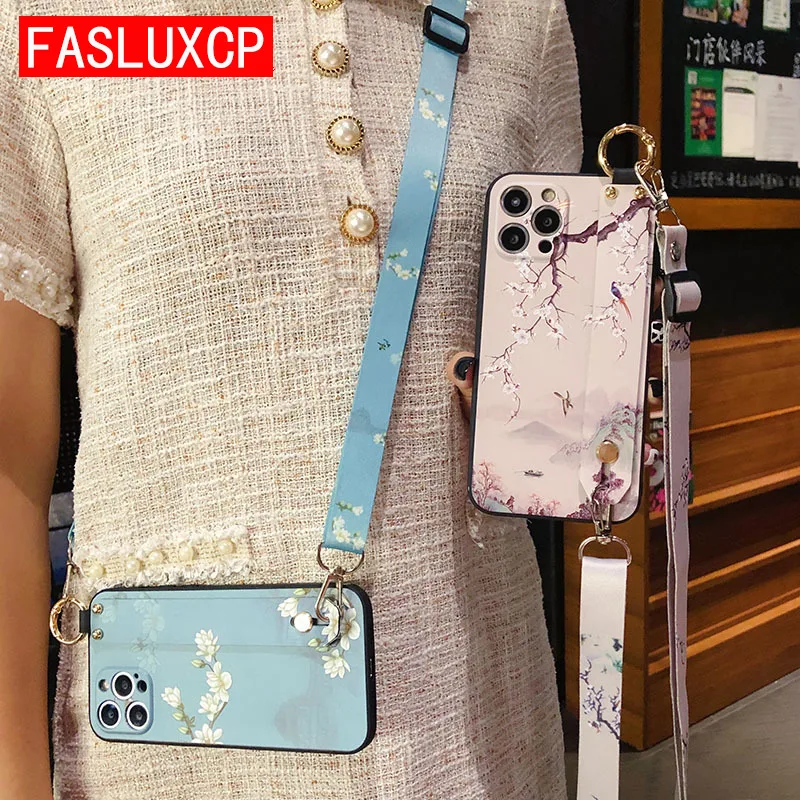- آيفون 13 14 برو ماكس حافظة موضة Crossbody الكتف حزام زهرة ورقة حامل هاتف غطاء آيفون 12 11 X XR XS 7 8 Plus