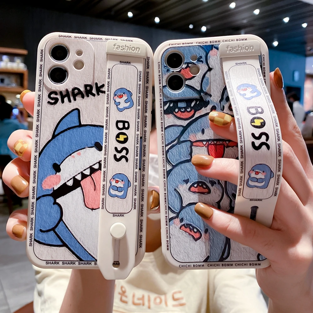 - الكرتون لطيف القرش المعصم الفرقة حامل قضية الهاتف آيفون 11 12 13 برو ماكس SE2 X Xs XR 7 8 plus ساحة سيليكون لينة الغطاء الخلفي